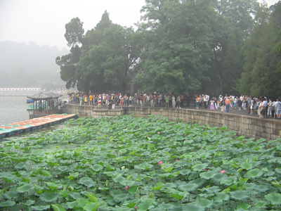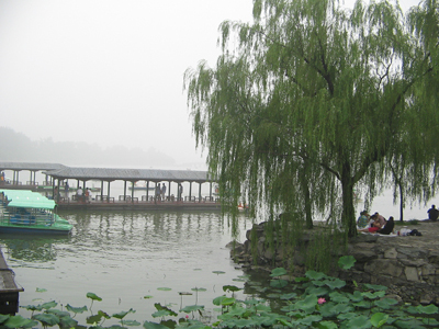 頤和園的水面〈昆明湖〉占全園面積的四分之三,煙波淼淼,蓮葉田田,西望群山起伏,北望樓閣成群,湖中有一道西堤,堤上桃柳成行,拱橋掩映,造型優美。