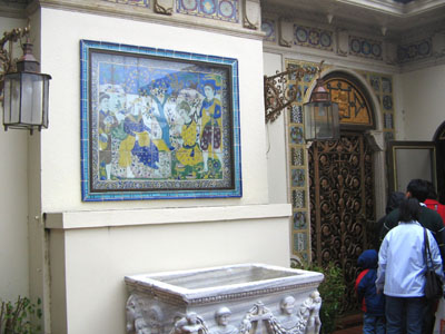 到達赫氏古堡所在地之後,須買票並搭園內的接駁班車上山,有指定的梯次,原則是半小時一班,但湊足25人就可以出發。一上山,目光就被成群結對的牧牛給吸引住,從大門口進入,結果纍纍的橘子樹,也令人眼睛一亮。一下車就有導覽員前來打招呼,並引導參觀,一行兩人,一人講解,一人在後面趕人,意思就是不能亂跑(似乎也在監視?)也有規劃可以走路的線,不能走的會圍起來,最後看完室內游泳池就坐車下山,整個參觀行程大約將近兩小時,但扣除30多分鐘的上山下山公車,以及等導覽員集合說明參觀規則,真正參觀的時間並不多,可以說是走馬看花。導覽員一再交代入內參觀的規矩,為了維護文物,所有的雕像、古董、文物都規定是不能摸,甚至裡面的東西不論牆啊、柱啊都不可碰,而且一定要跟著導覽員走,不可脫隊,以防迷路,更離譜的是連上廁所也要專人帶去,且為了維護地板,參觀時大家都要站在地毯上欣賞,不能超過地毯。